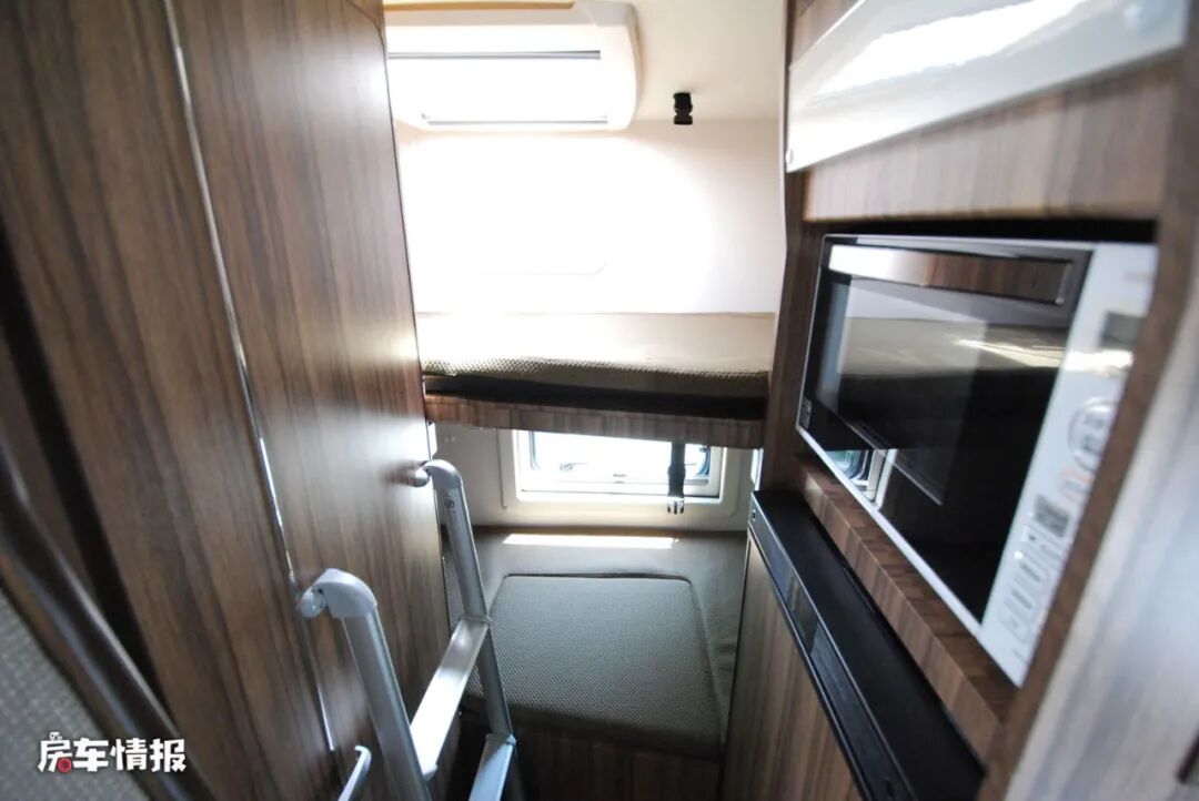 最后是车厢尾部的休息区,采用上下床的设计,均可以容纳一个人使用,上方床铺带有天窗,下方床铺带有侧窗,整体的采光度还是比较不错的。