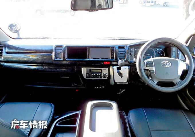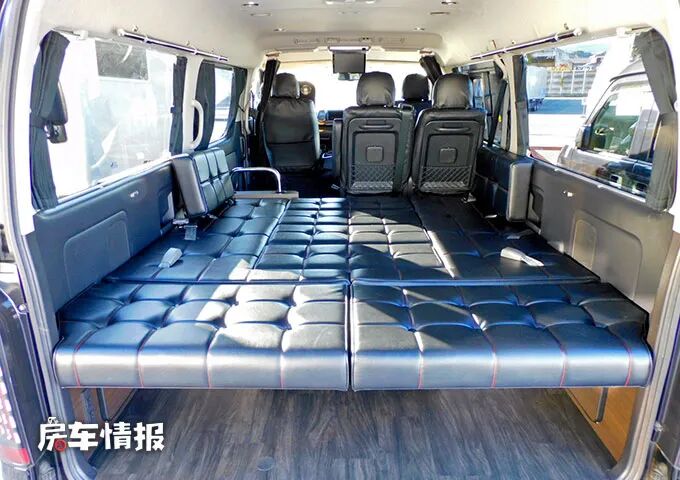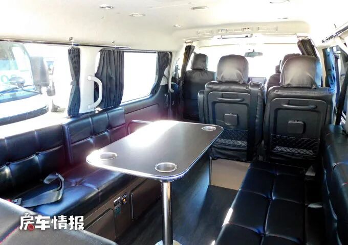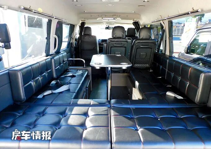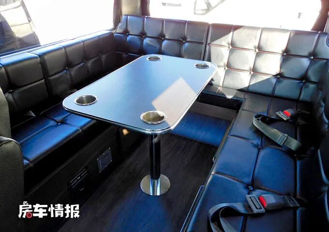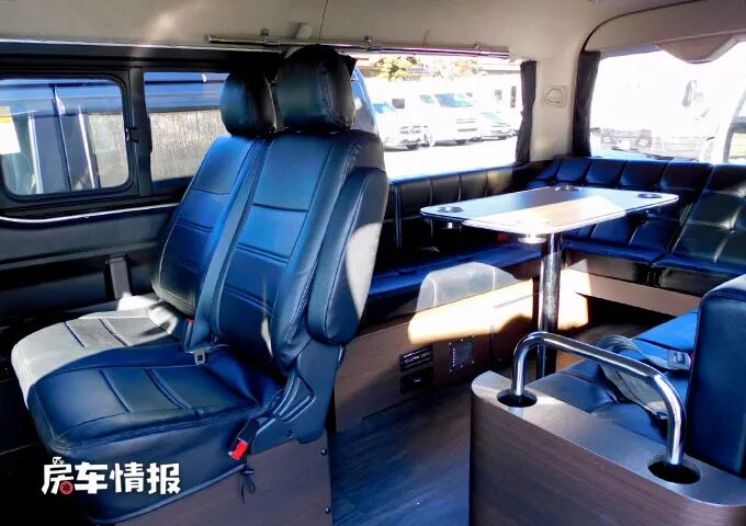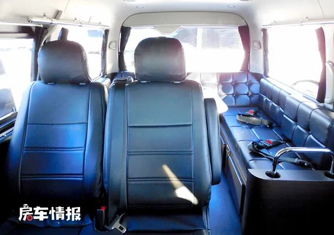 进入车内会发现整体的设计还是比较有意思的,和我们常见的床车内部布局不太一样,最前方保留了原车的双人皮质座椅,并配备了安全带。