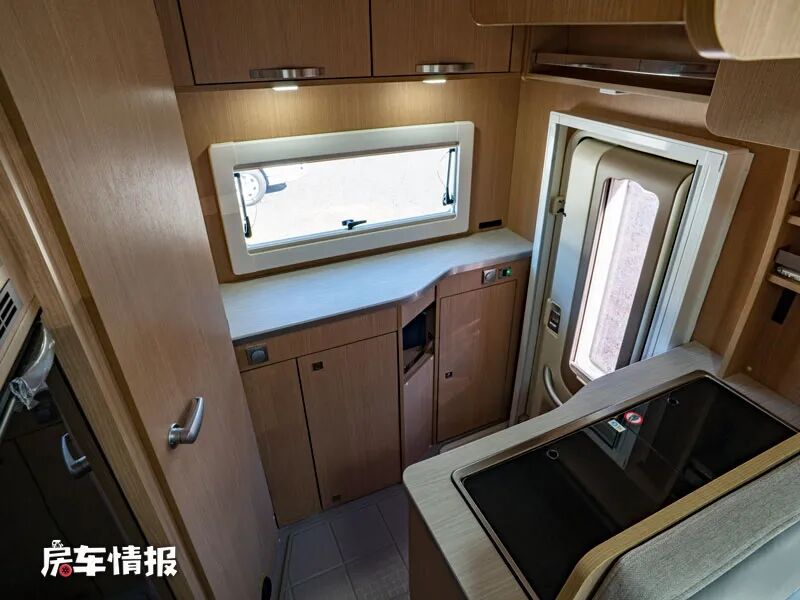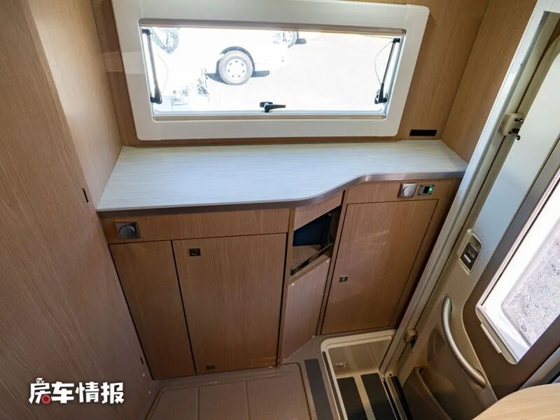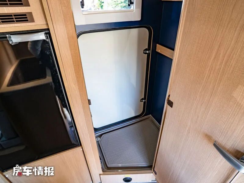 旁边的单独房间,日常可以作为储物空间使用,但是有需要后期可以配置一台便携式马桶,解决途中的应急需求,后期还可以选装淋浴房,使基础的洗漱得到满足。