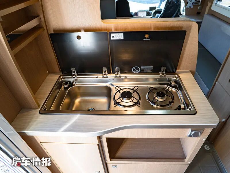 厨房区位于乘客门的前后两侧,前方为主操作台,台面上提供了翻盖的不锈钢洗菜池以及双孔燃气灶,顶部还配置了吸顶式的抽油烟机。
