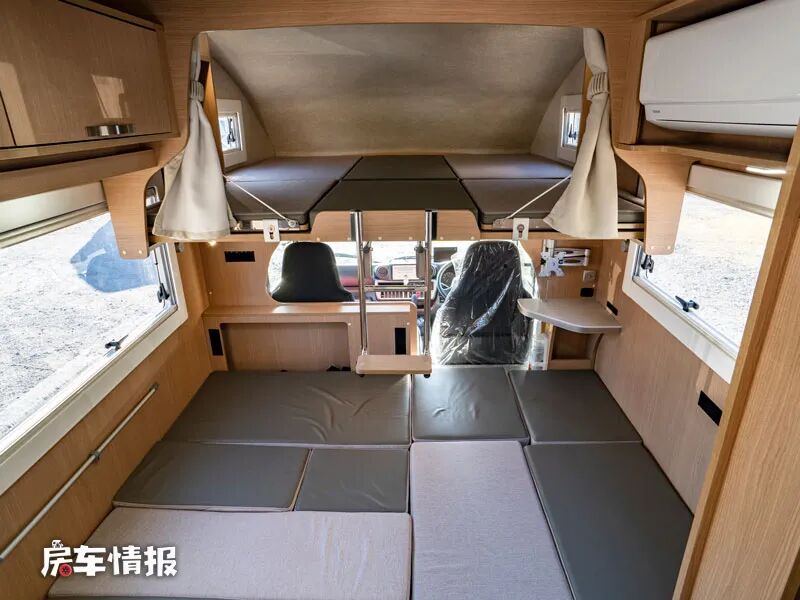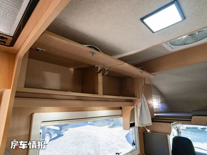 最前方驾驶室顶部是标配的额头床休息区,这也是车内唯一一张固定式的床铺,带有拓展抽拉功能,日常可以满足两个人的睡眠需求。