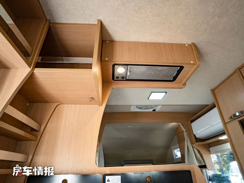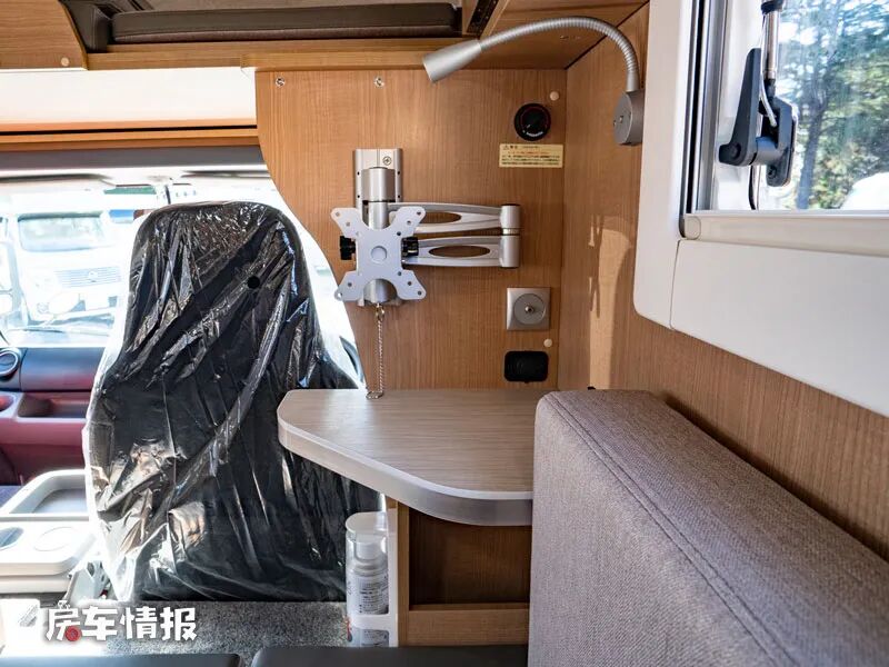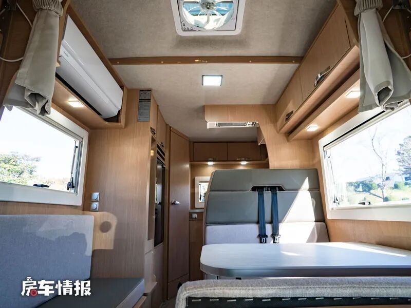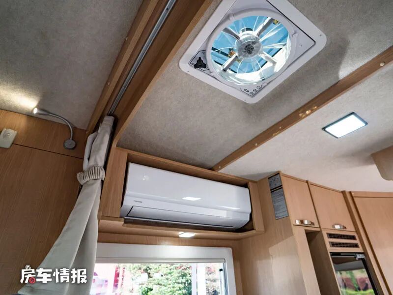 在L型沙发前方,即主驾驶后方,还预留了可以安装电视的折叠支架以及一个小型的置物平台,同时L型沙发顶部则嵌入了一台家用变频空调,另外在对卡座沙发顶部也提供了基础的吊柜,满足日常储物的需求。