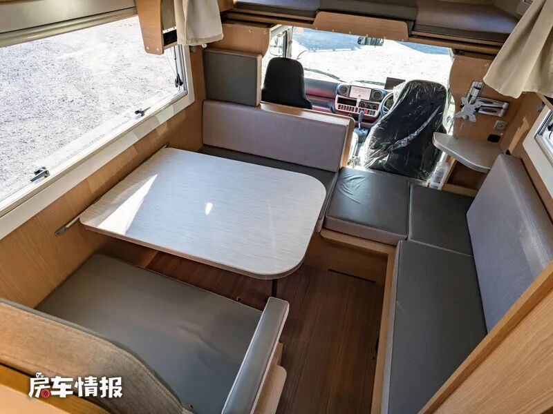 驾驶室后方是全车的会客区域,常规状态下是四人对卡座沙发+餐桌以及一组L型沙发的布局,这样在驻车时可以容纳更多的人在这里就餐小聚。