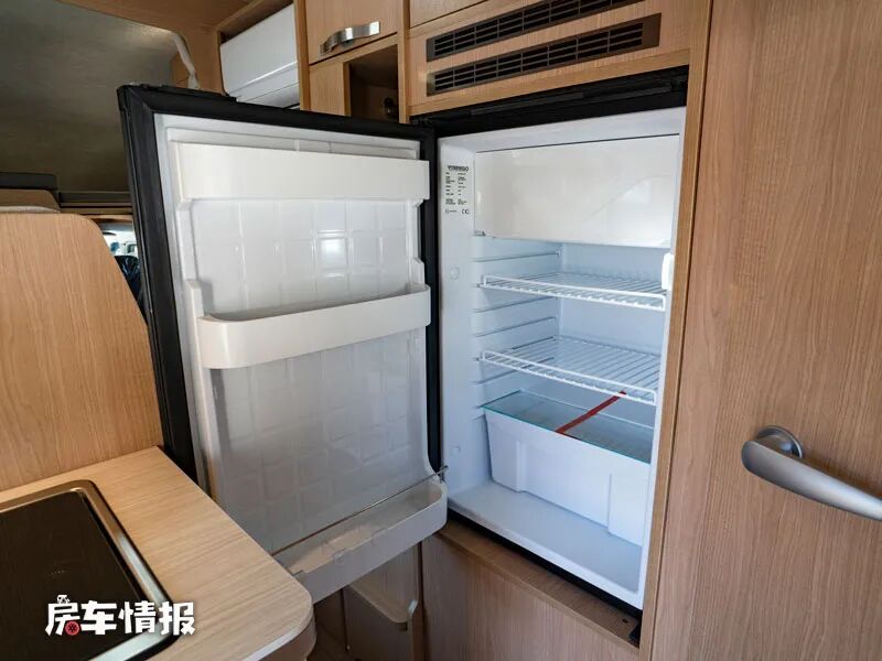 而在厨房操作台旁边则是一台90L的车载冰箱,内部也提供单独的冷冻区域,可以满足日常分类存储食材的需求。