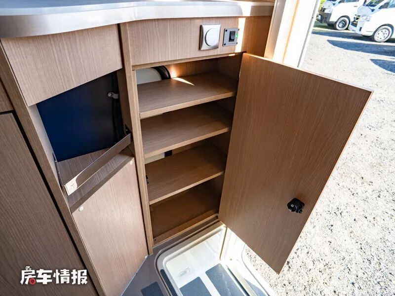 后方则是备菜区域,下方则是全车的主要储物空间,最外侧还打造成了鞋柜,可以存放几双常穿的鞋子。