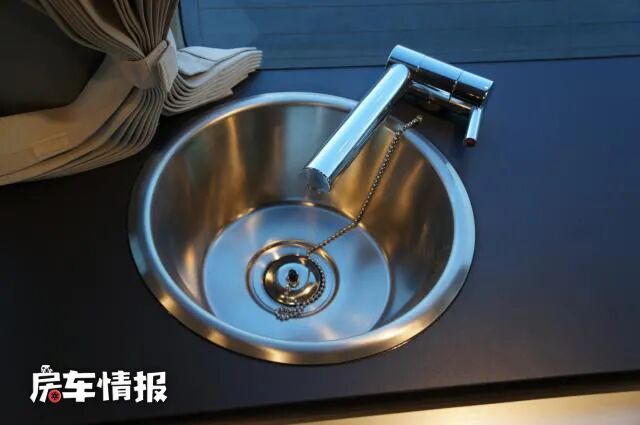 而L型沙发的另一侧则是一个长条的操作台,台面上还带有基础的不锈钢水槽,侧面因为配置了电源接口,所以后期也可以使用其他一些小型的厨用电器,比如便携式电磁炉、卡式炉或是微波炉,来满足基本的烹饪需求。