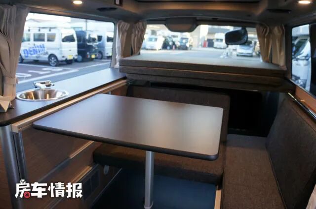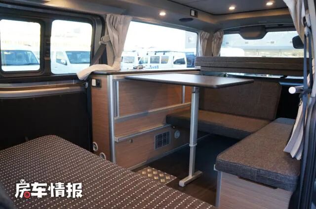 当驻车时,双人座椅可以转向后方,与后方的L型沙发座椅形成一个半封闭式的会客区域,中间也提供了基础的餐桌,可以满足日常的就餐需求。