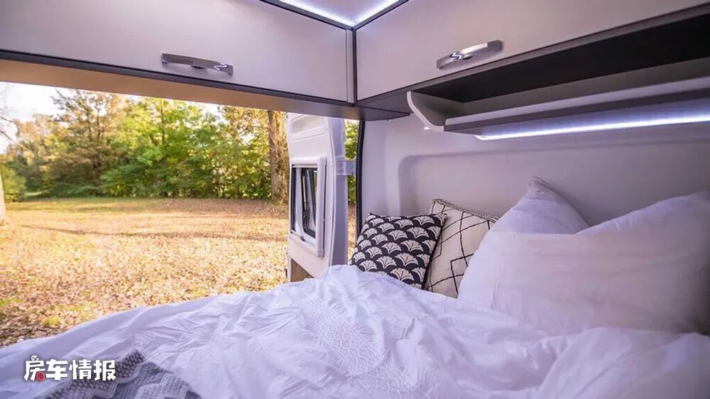 最后是位于车厢尾部的横置双人床,日常可以为两个人提供睡觉休息的地方,顶部还提供了一圈U型的储物吊柜,用来存放平时换洗的衣物还是没问题的。