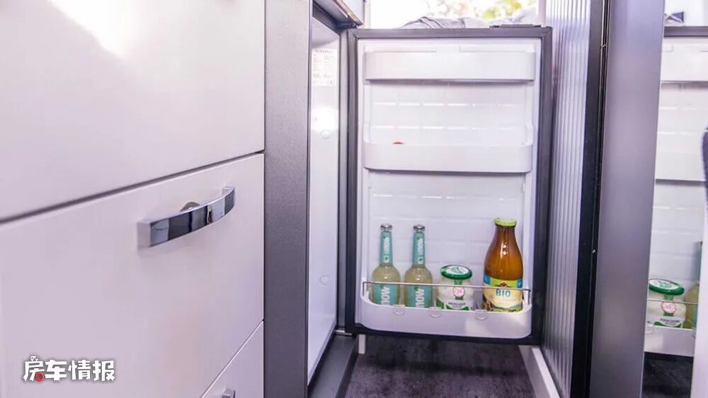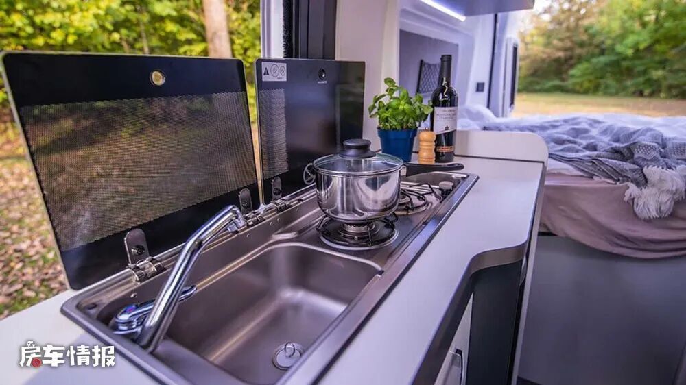 厨房区位于乘客门后方,台面尺寸还是比较宽敞的,采用了比较欧美的一体式翻盖设计,左边是不锈钢的水槽,右边是双孔的燃气灶,可以保证基础的烹饪需求。另外全车还提供了一台烤箱以及一台85L的冰箱,以满足日常存储食材的需求。