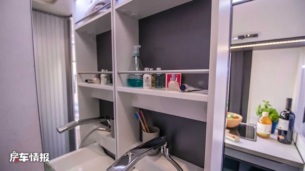 与之相对的则是全车的独立卫浴室,整体是长方形的布局,采用推拉门的设计,相比圆弧形的设计推拉更简单方便一些。内部空间也足够一个成年人使用的,带有洗手台盆、置物柜、淋浴花洒、梳妆镜和马桶等设备,可以满足日常出行的洗漱需求。