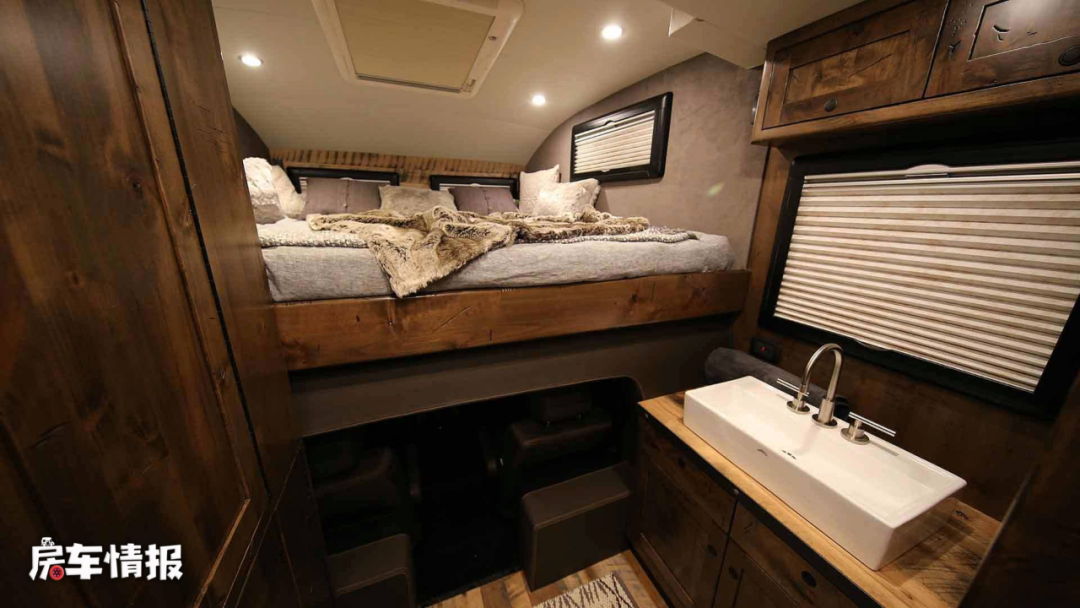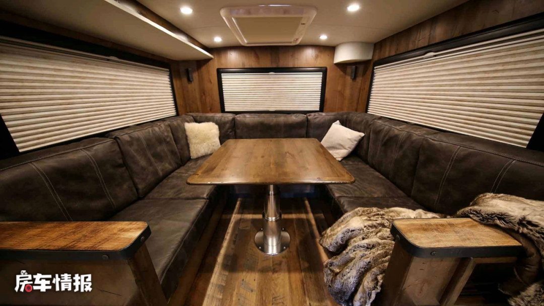 进入车厢内部,可以看到内部空间表现并没有外观看起来那么夸张,但在房车圈里空间也算是挺大的了,并且整个内饰部分走的也是传统美式粗犷风,比较符合整车越野硬汉调性。