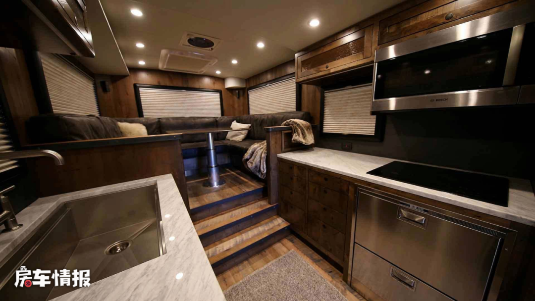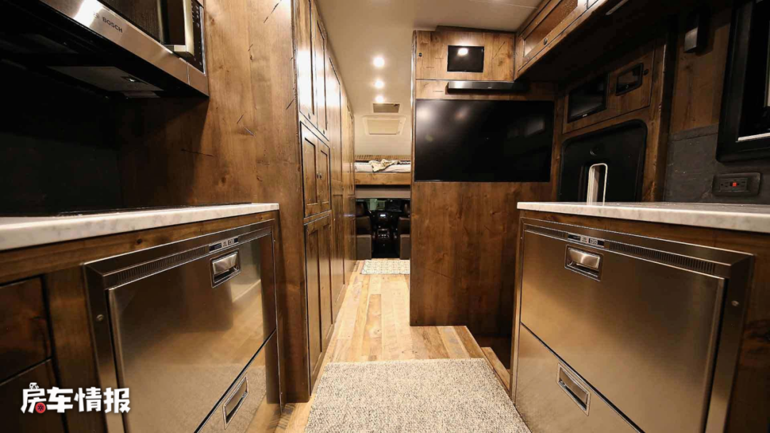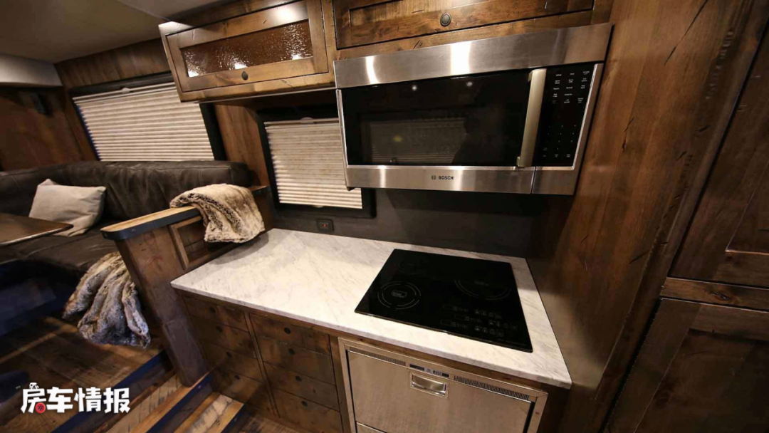 车厢中部左右两侧分别设置了厨房和卫生间区域,得益于车内充裕的空间,厨房和卫生间的尺寸都挺大,厨房采用仿大理石台面和不锈钢材质打造而成,除了提供常规的洗菜池、燃气灶、冰箱以外,这里还提供了烤箱、微波炉等设施,并且所有储物抽屉均带有机械锁止机构,避免在户外激烈驾驶时意外打开。
