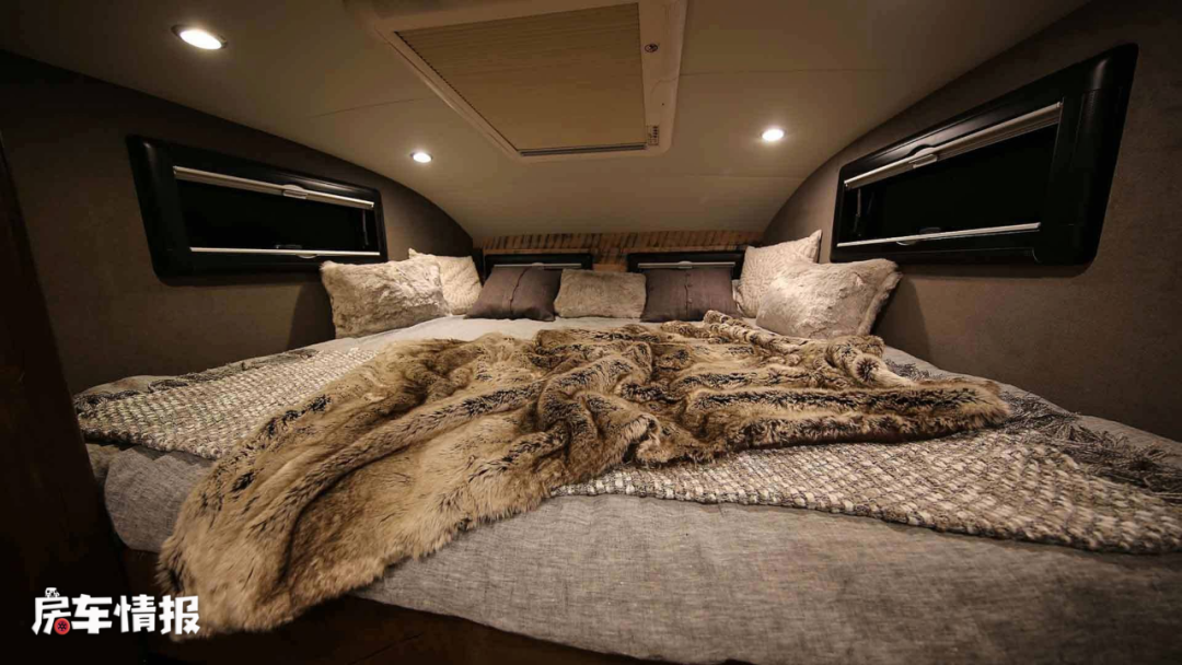 驾驶室顶部同样是一张尺寸巨大的额头床,尺寸基本上达到了2200*1800mm,可以轻松满足2名成年人居住休息,在加上车顶平直的造型,这里头部空间表现也很不错。