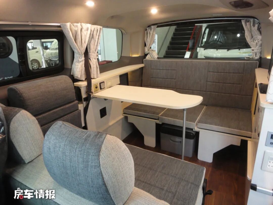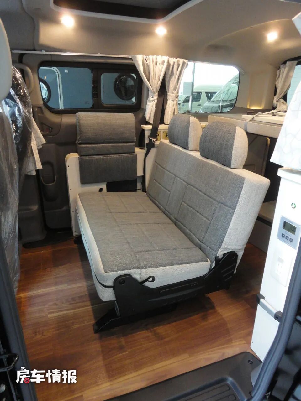 车厢内部设计比较温馨,顶部也带有照明灯,并提供了隐私拉帘,方便夜晚的时候使用。车内部保留了第二排双人乘客座椅,并配置了两条安全带。