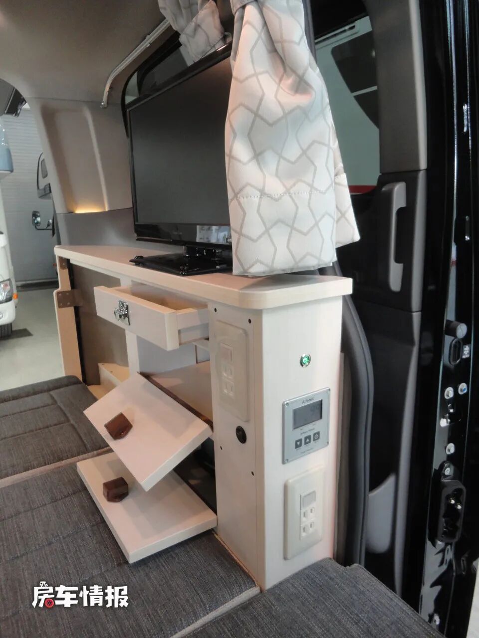 除去基本的睡床功能,在车厢尾部两侧也分别加入了储物柜的设计,其中一侧台面上还提供了一台16英寸的电视机,可以满足日常基础的娱乐需求。