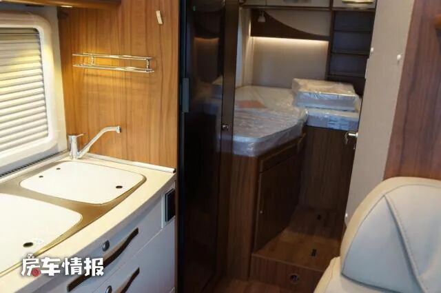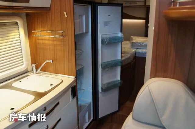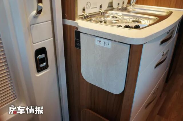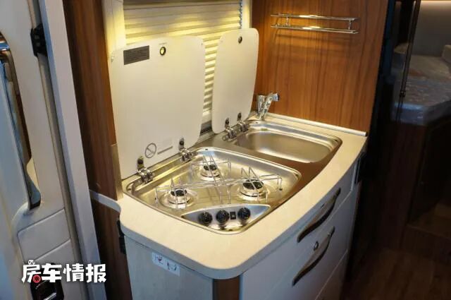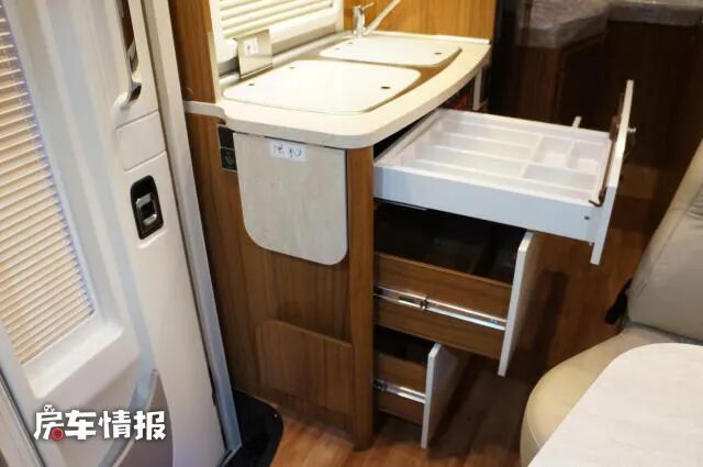 全车的厨房区位于乘客门后方,整体的尺寸算是中规中矩,台面上带有翻盖的洗手台以及三孔燃气灶,可以满足日常的基础烹饪需求,操作台侧面还带有延展的小桌板,下方则为多个储物抽屉,以满足日常的储物需求。