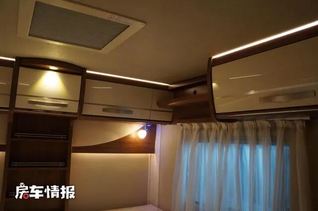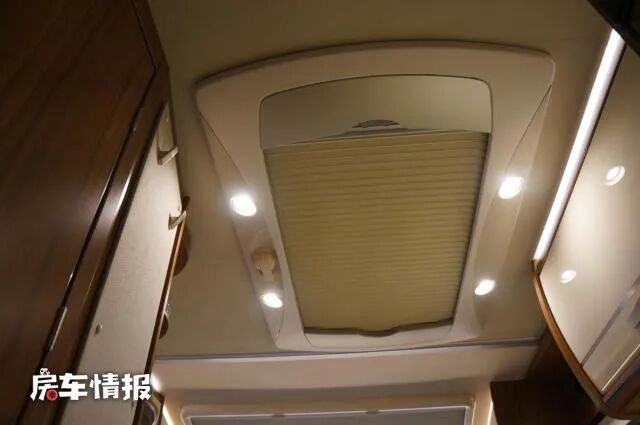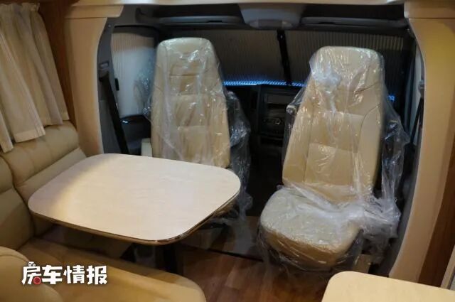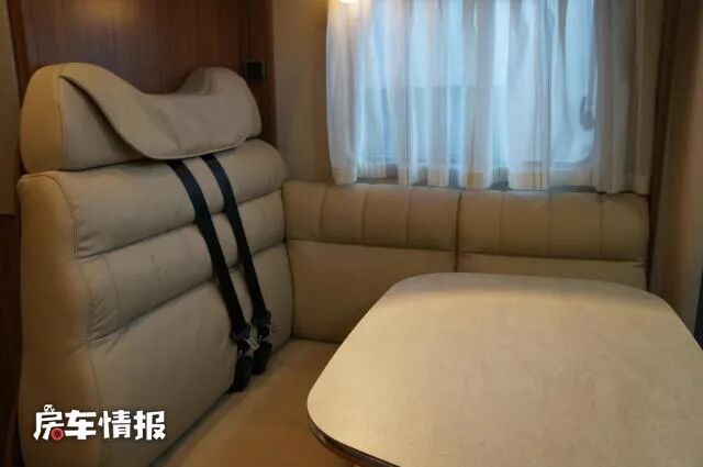 进入车内,可以看到整体采用了较为沉稳的深色系装饰,在暖色灯光的映衬下也显得比较有气氛,虽然整体的布局和我们常见的C型房车相差不多,但是最能体现全车空间大的就在于车厢尾部的休息区。