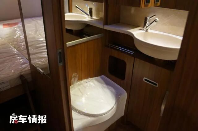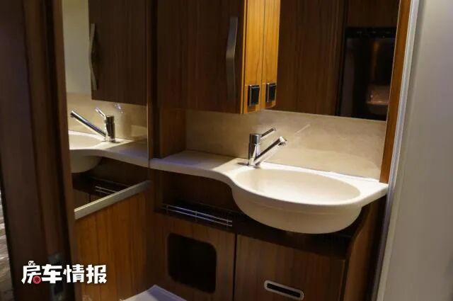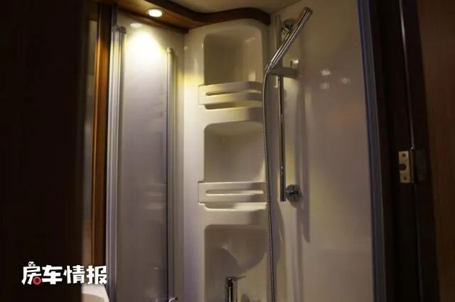 与之相对的则是全车的独立卫浴室,内部采用了干湿分离的设计,外侧是卫生间,提供了固定式的马桶、洗手台、大尺寸梳妆镜,内侧为独立的淋浴房,匹配淋浴花洒和置物架等设施,完全可以满足出行的洗漱需求,卫浴室门外同时也加装了一面穿衣镜,日常使用起来更加方便。