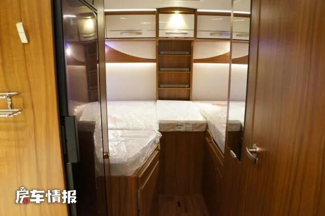 和以往我们常见C型房车中的横置尾床或是纵置尾床的休息区布局不一样的是,这款车内的休息区更像是大型拖挂房车上面的布局,采用了两张纵置的单人床,又特别像酒店标间的设计,如果后期有需要中间的部分还可以进行拓展,变成一张大尺寸的床铺,足够容纳三个人使用,床头处也加入了软包的设计,同时还提供了基础的吊柜和储物格,方便日后的使用。