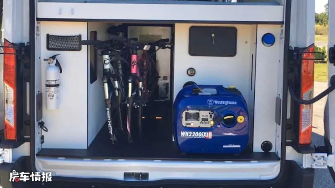 电路上,这款露营车搭载了一台基础的逆变器,提供315Ah的锂电池,另外还有一台便携式的发电机;水路上则提供113L的淡水箱和52加仑的灰水箱,整体水路系统是通过一个12V的Shurflo水泵供给的,同时车内还提供了空调、换气扇、充电插口、USB接口等生活所需配件。