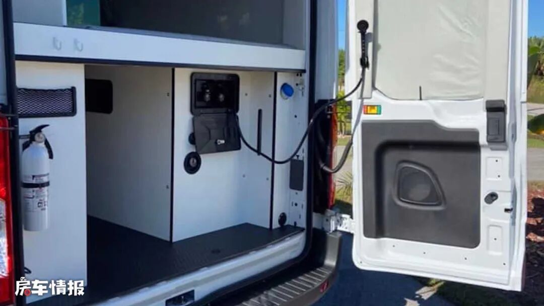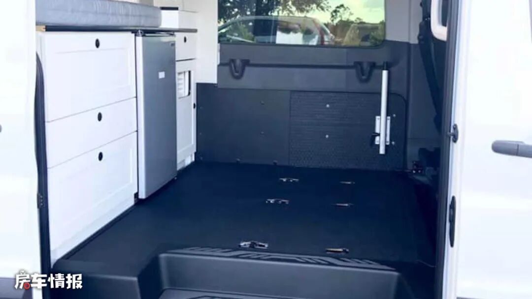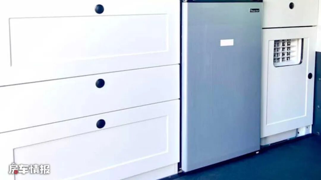 那作为一辆露营车来说,单纯的睡床是不能够满足的,这款车极其充分的利用了床板下方的空间,在床板前方的下方,除了提供基础的储物柜,还嵌入了一台车载冰箱,可以存放一些日常的食材,旁边还带有一台小型的微波炉,方便热热饭菜。
