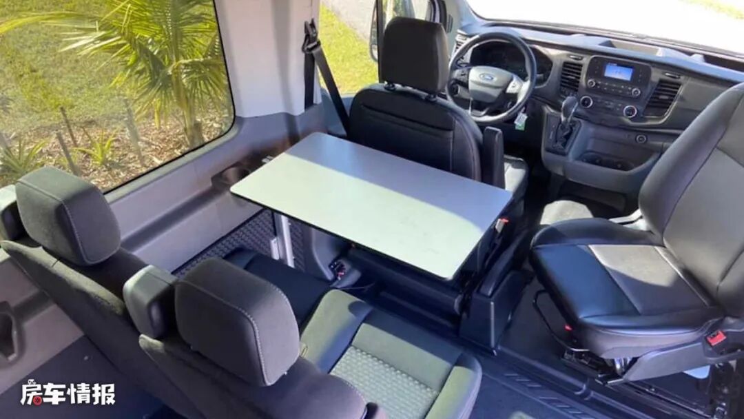 主驾驶后方是双人卡座沙发+餐桌的设计,结合可以向后旋转的主副驾驶座椅,就可以打造成一个四人的会客区域,也能满足日常的就餐和小聚需求,而且因为座椅带有可调节的功能,所以即便长途旅行也可以接受。