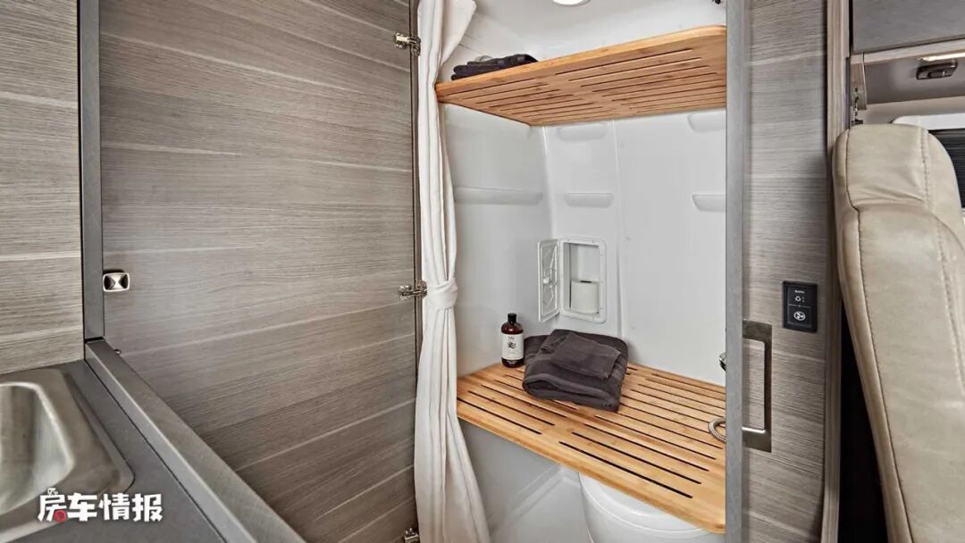与之相对的是全车的独立卫浴室,操作台后方则是整车的储物柜,作为一辆B型房车,能在内部拥有如此大空间的储物柜也实属难得,不还有一个巧妙的设计也隐藏在卫浴室里,就是卫浴室的门其实可以作为分隔休息区与前方生活区的隔断门,这样就会得到一个比较私密性的休息空间,而卫浴室在日常不使用时还可以加入隔断用来储物。