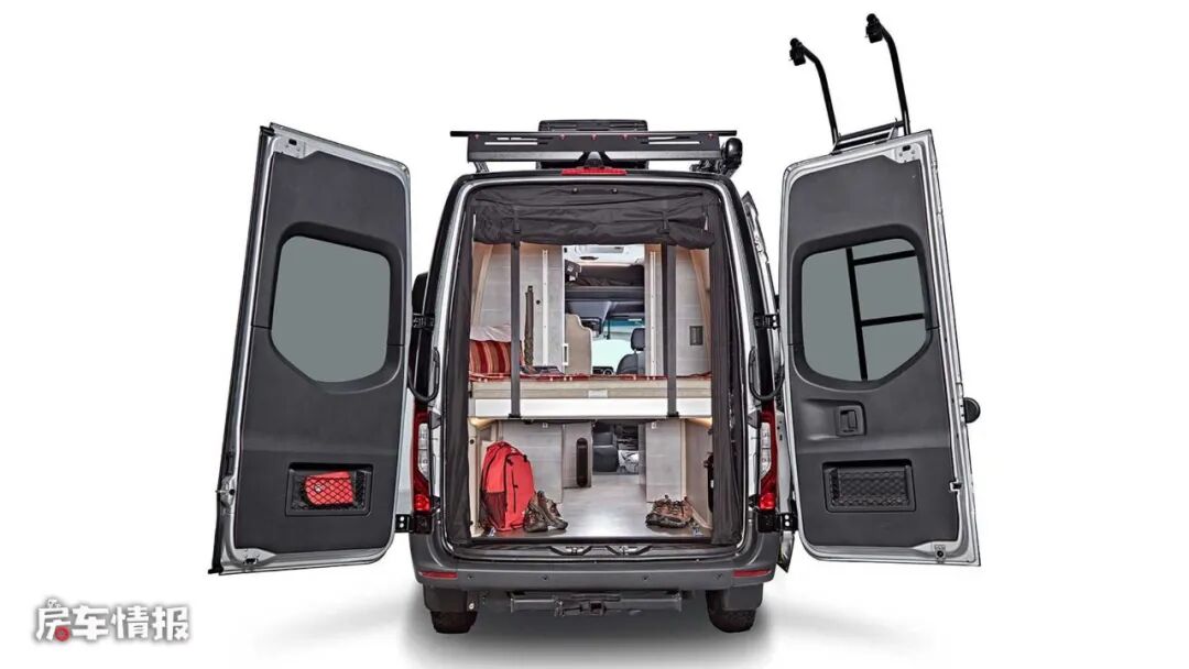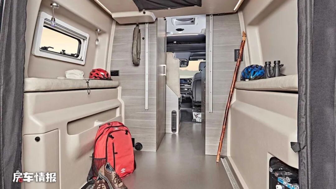 最后是位于车厢尾部的休息区,常规状态下为可以放置大件行李的储物空间,到了夜晚则可以降下顶部的升顶床,从而能够为两个成年人提供充足的睡眠空间,在白天也不影响存放行李的需求。