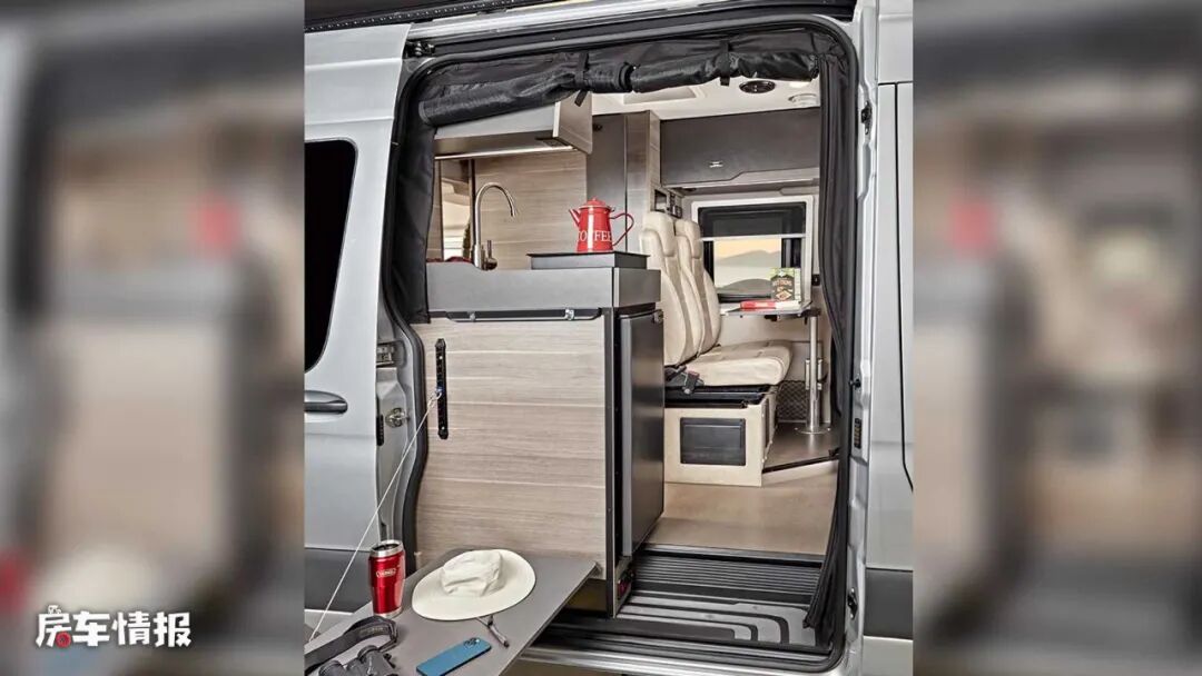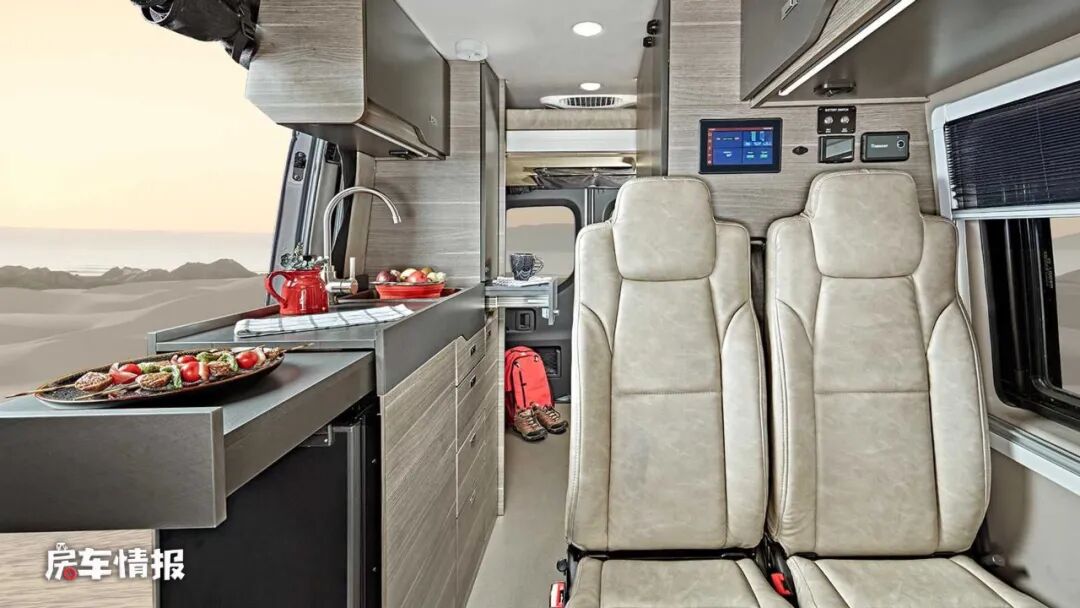 车内的布局其实大体和我们国内的B型房车相当,最前方主驾驶后方是全车的会客区,采用双人沙发座椅+餐桌的布局,而车内的水电控制面板则位于座椅上方的壁板上,操作起来也比较方便。