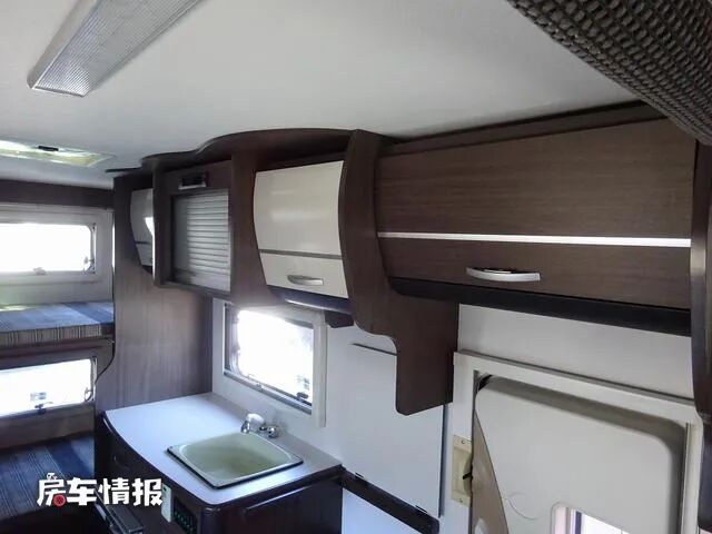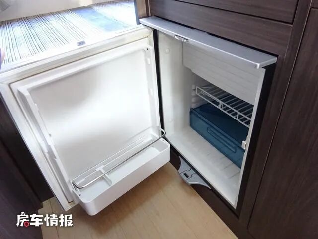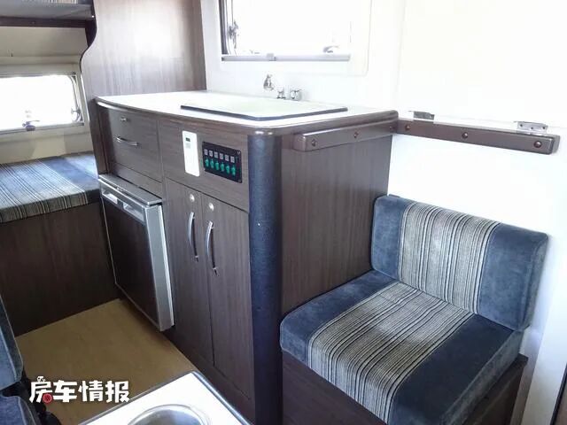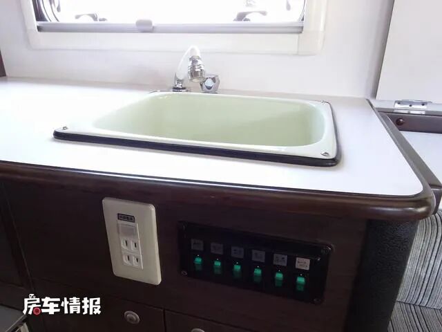 乘客门后方是全车的厨房区域,台面上带有基础的水槽,下方还配备了车载冰箱,另外侧面也提供了充电插口,可以后期再加装卡式炉或者便携式的电磁炉,以满足更多的烹饪需求,同时厨房区顶部也提供了基础的吊柜,可以存放一些烹饪所需的材料和用具。