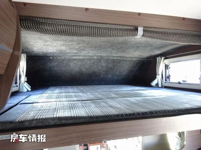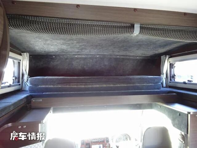 在最前方驾驶室顶部的额头区域内,是标配的额头床,采用抽拉式的设计,这样日常行车时就可以为下方的驾驶人员预留出更充裕的头部空间,另外两边都带有外推窗,整体的采光度也还不错,天气好的时候还可以用来通风换气。