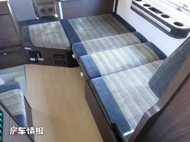 正对乘客门的是全车的会客区,采用经典的四人对卡座沙发+餐桌的设计,餐桌的面积还是不错,上面也带有杯槽,顶部还提供了基础的储物吊柜,可以存放一些日常的物品,方便后期拿取。