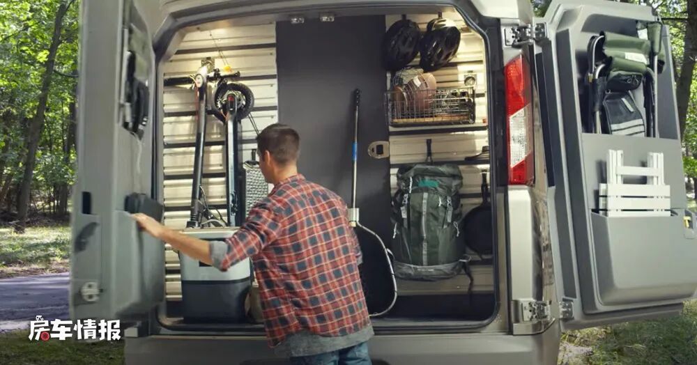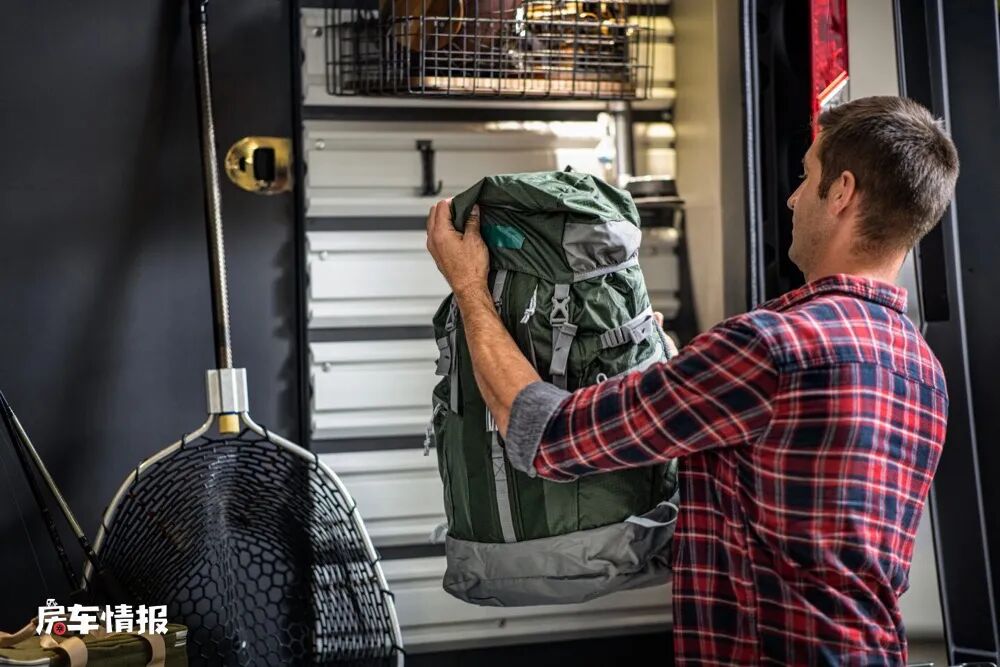 将后尾门打开,可以看到车尾部的空间与前方的生活区做了隔断,车内车外都可以拿取物品,尾部带有挂钩、置物架等多种可储物的配件。