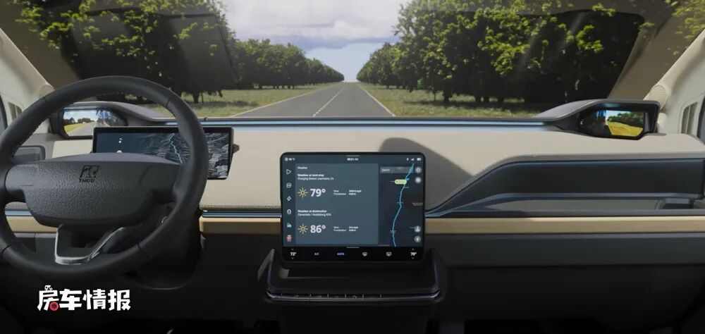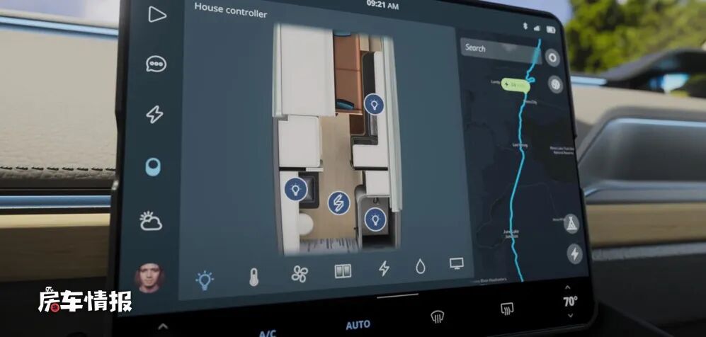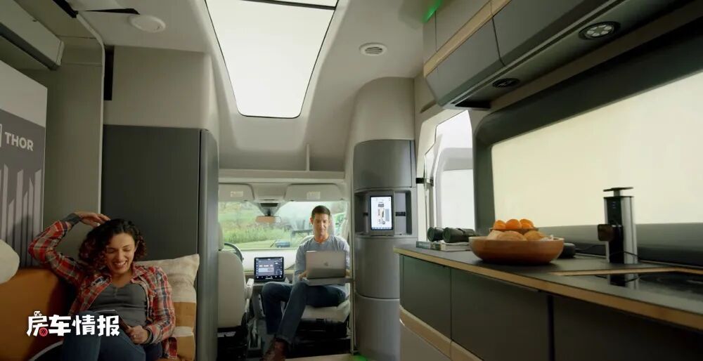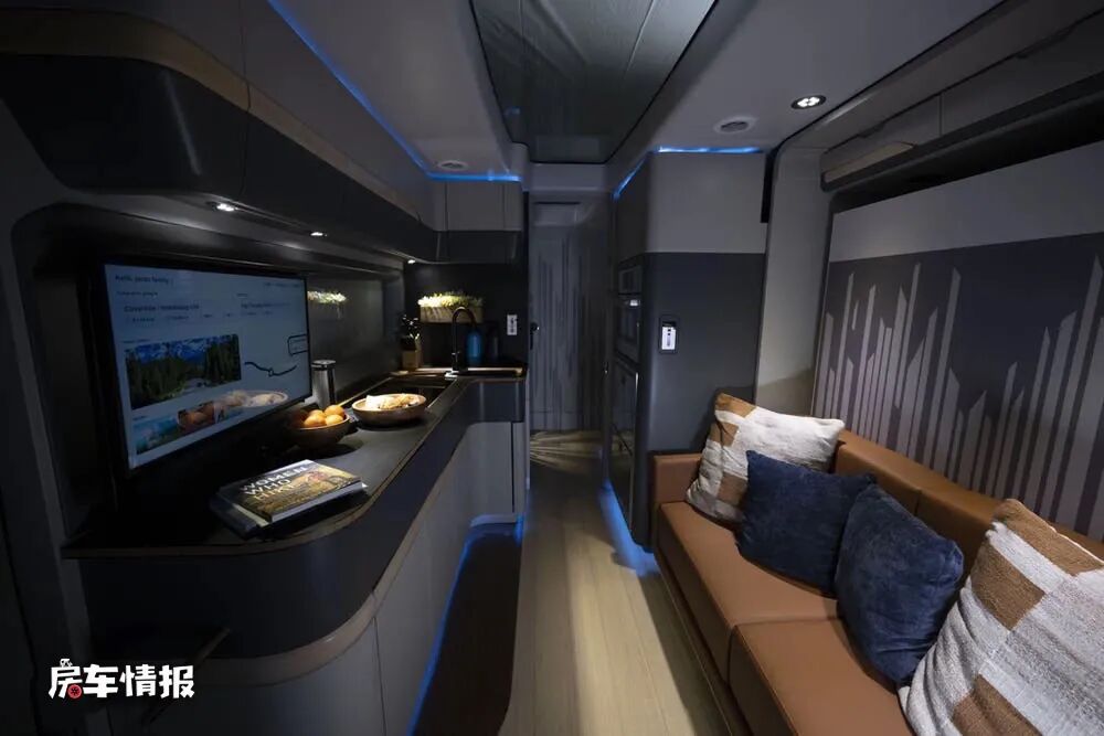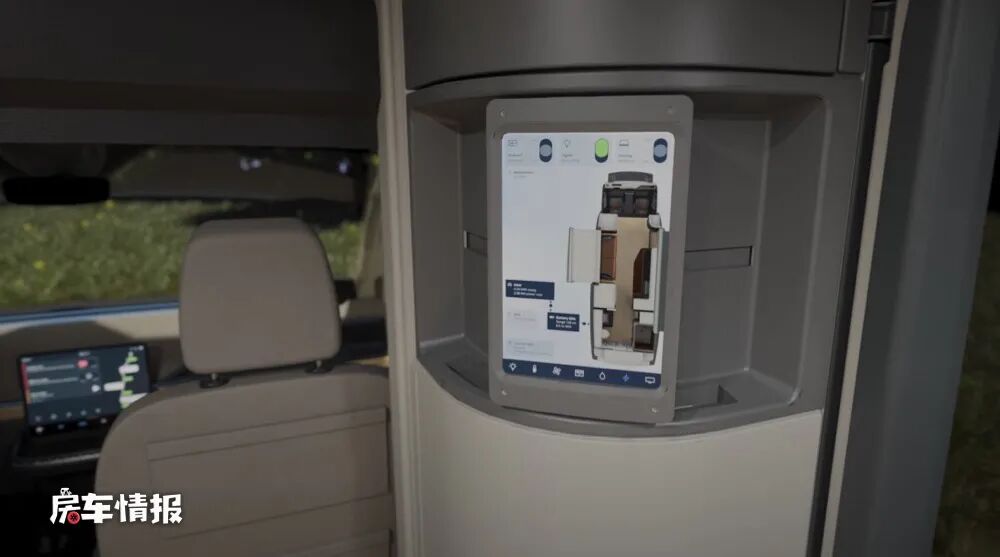 作为一辆电动露营车,其内部的驾驶室也和我们平时所见的大不相同,属于高度智能化的设计,配备了超大尺寸的中央触摸屏,带有全面的驱动和离网露营电源管理系统,系统里包含了剩余电量和当地可充电的最新信息,并提供当地的娱乐餐饮信息,方便车主在车辆充电时可以很好的利用这段空闲时间,另外这个系统还可以通过智能手机推送房车路线规划,包括本地POI、数字清单、带导航功能的数字仪表盘,以及可以对照明和供暖等生活区设备的操作,功能不仅强大而且操控也很便捷。