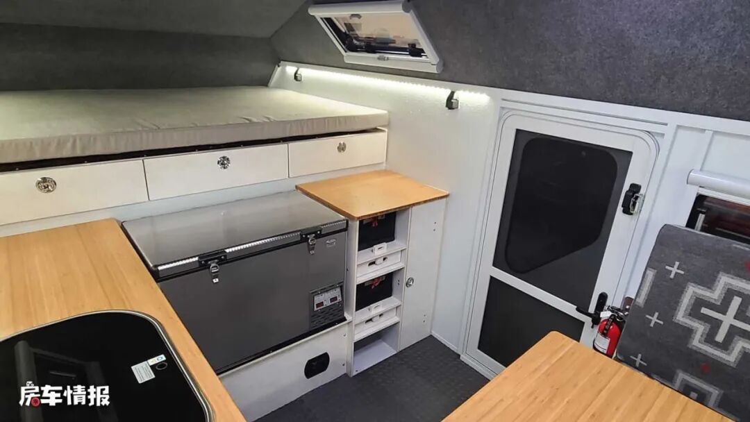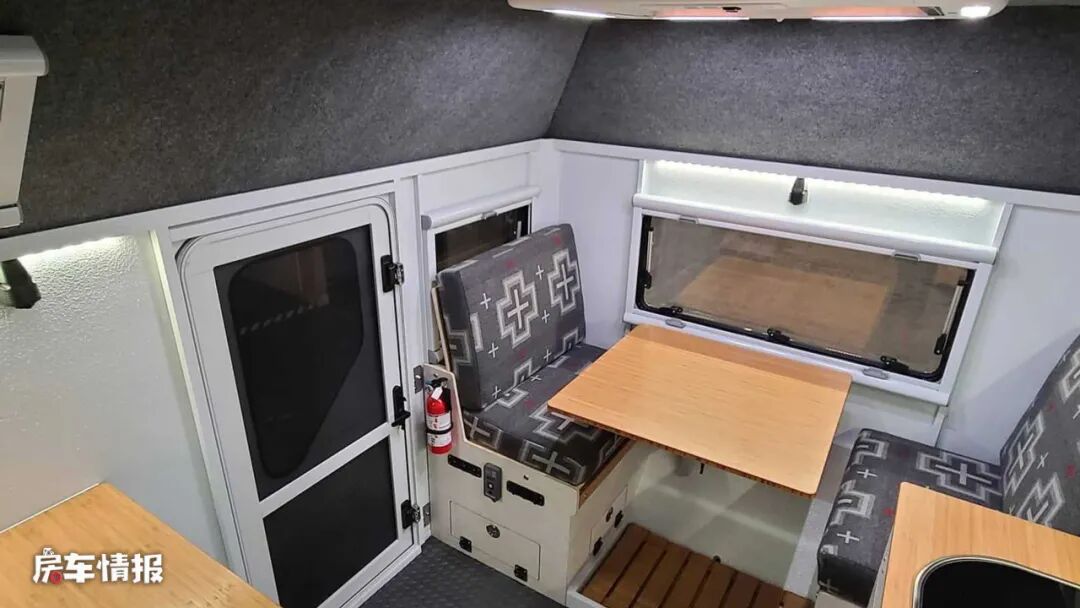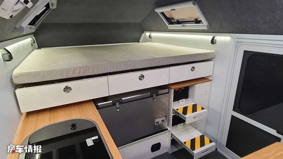 全车采用了右后上门的设计,进入车厢内部之后,整体的设计也比较现代简约,在最前方是一张带有抽拉功能,可以容纳两个人睡觉休息的床铺,两侧还配备了外推窗,可以保证整个区域的采光和通风。