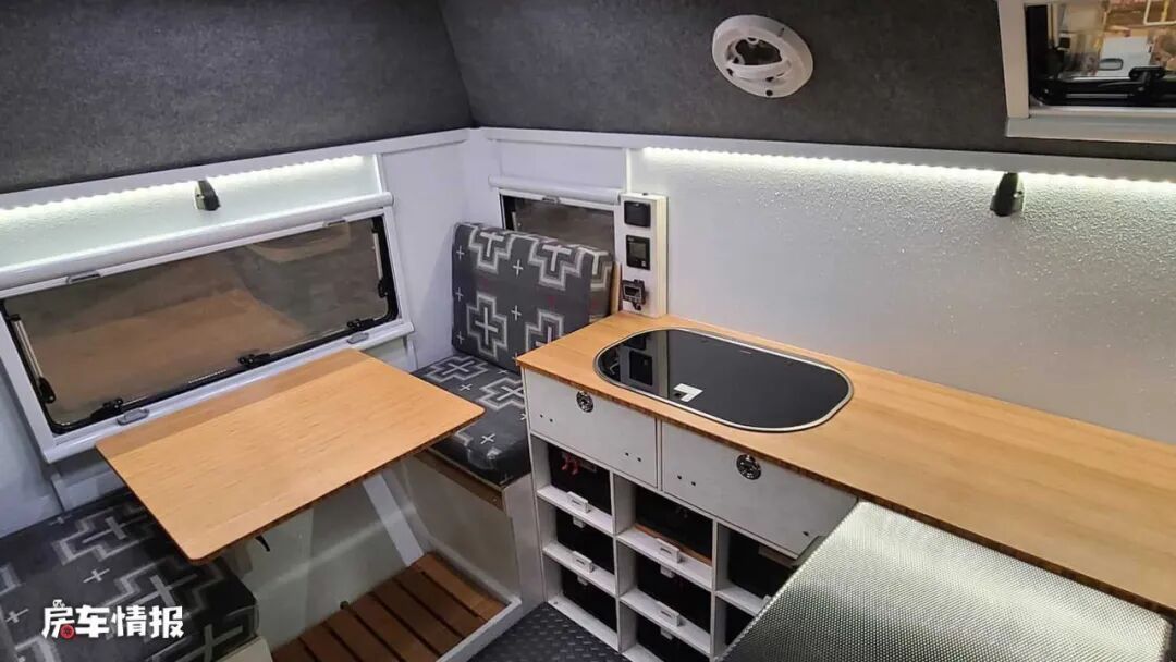 厨房操作台正对乘客门,尺寸也比较理想,台面上带有翻盖的水槽和燃气灶,可以满足日常的基础烹饪需求,另外在台面下方则提供了多个储物格,可以存放日常物品,以此来提升整辆车的储物能力。