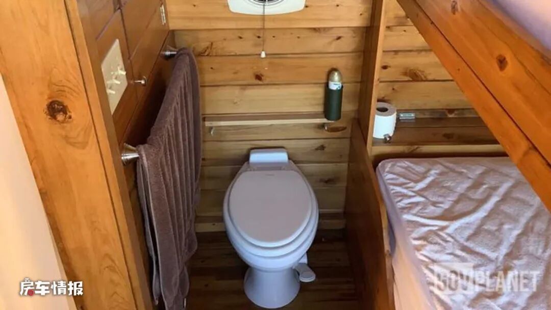 床尾处则是提供了一个固定式的马桶,侧面墙壁上带有排风扇,可以解决临时的应急需求。后方则是一间独立的淋浴间,内部带有基础的热水器,以供日常的洗漱需求。