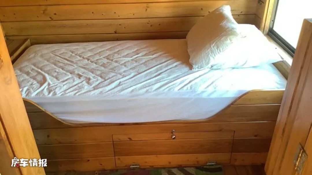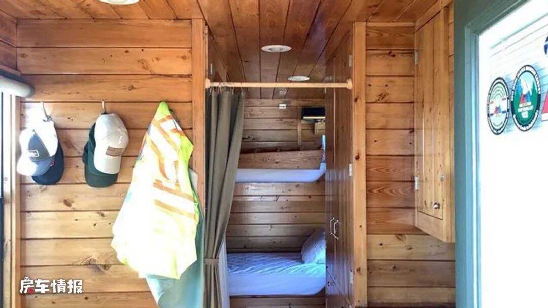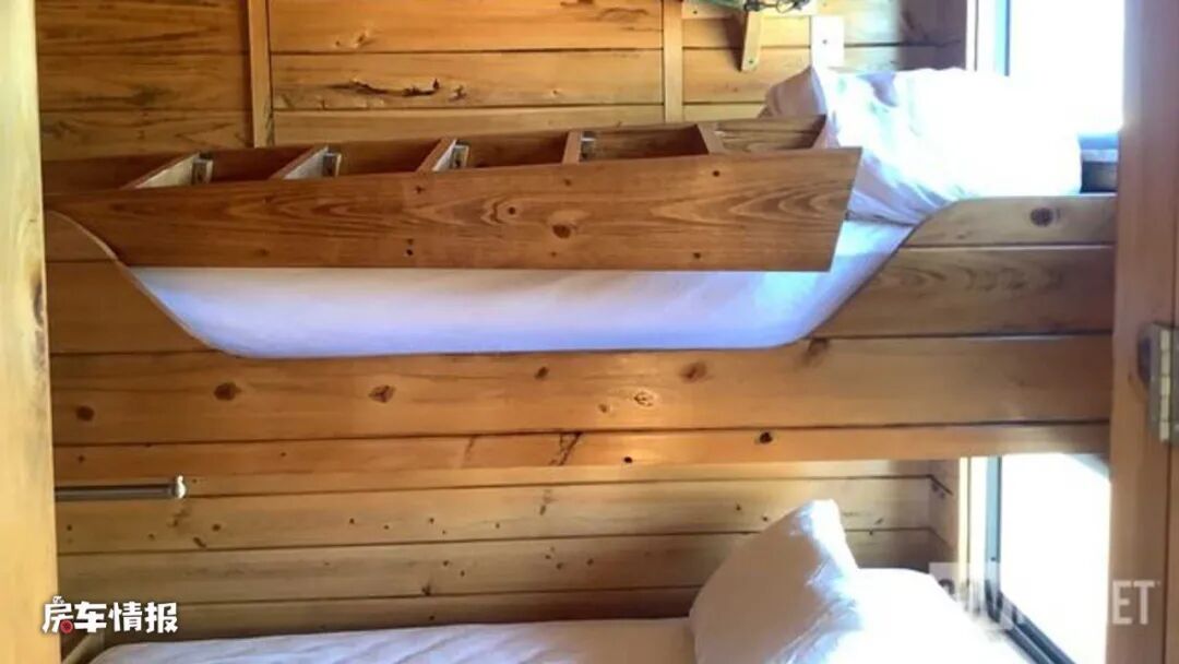在最前方是全车的休息区,采用了上下床的设计,一共可以容纳两个成年人,床头处都带有采光的窗户,所以这个休息区还是很通透的,并不会感觉到压抑。