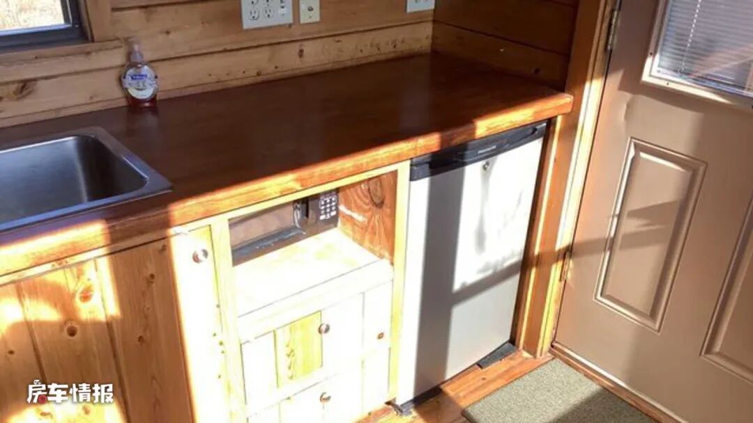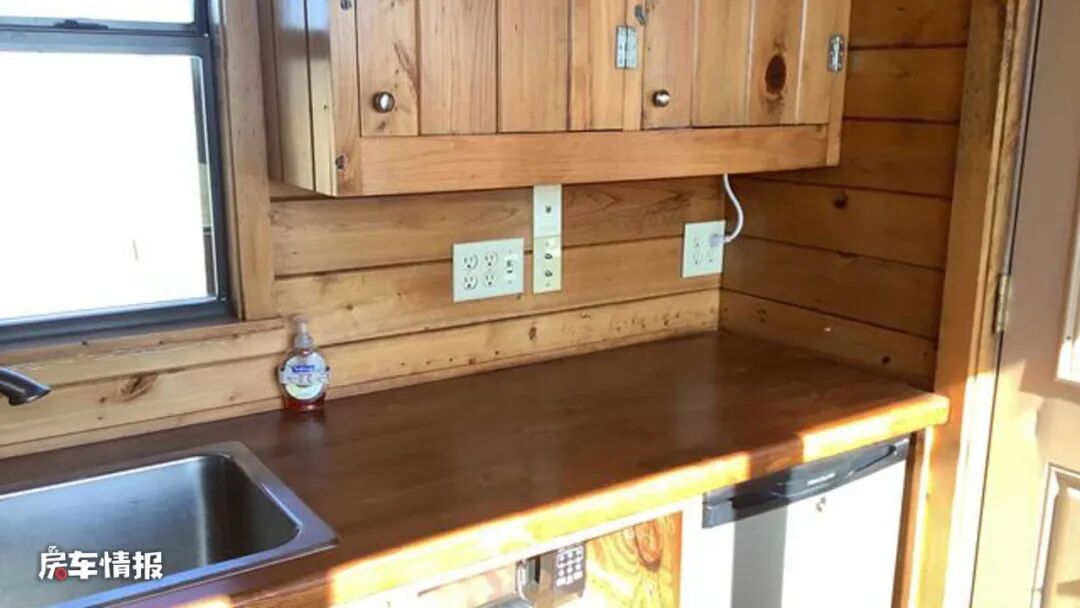 车厢后方为全车的厨房区,与前方的休息区带有拉帘作为分隔,也保证了休息区的私密性。厨房操作台的面积还是非常宽敞的,带有大尺寸的不锈钢水槽,侧面墙壁上还配备了足够多的电源插口,所以也可以后期加装便携式电磁炉或者卡式炉以及小型的厨用电器。