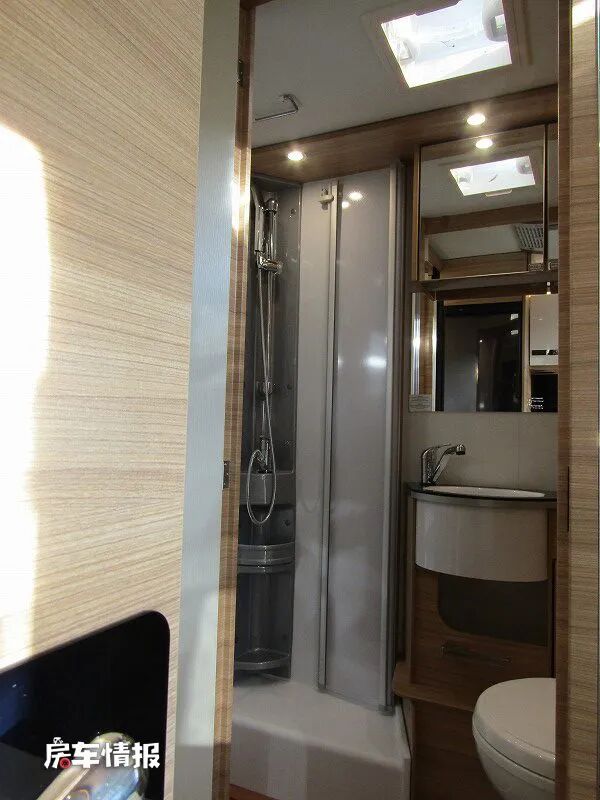与之相对的是全车的卫浴室,采用了干湿分离的设计,内侧是淋浴间,外侧则提供了马桶、洗手台盆、梳妆镜,可以满足日常的洗漱需求。