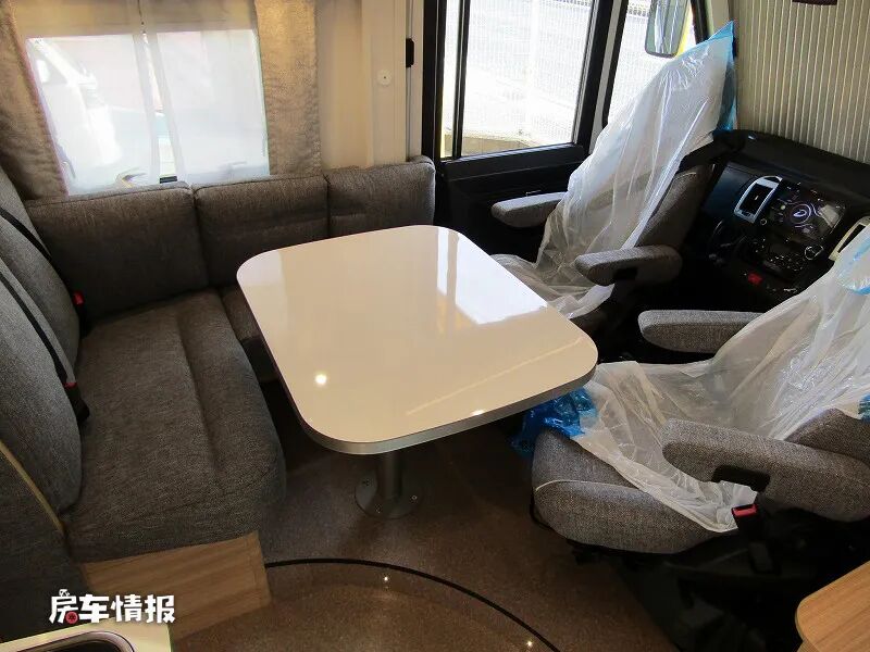 会客区域是由L型沙发座椅+餐桌组成的,L型沙发配备了两条安全带,所以整车在行驶过程中可以乘坐4个人,结合可以向后旋转的主副驾驶座椅,可以形成一个围绕式的环形布局,可以满足日常就餐会客或者工作的需求。