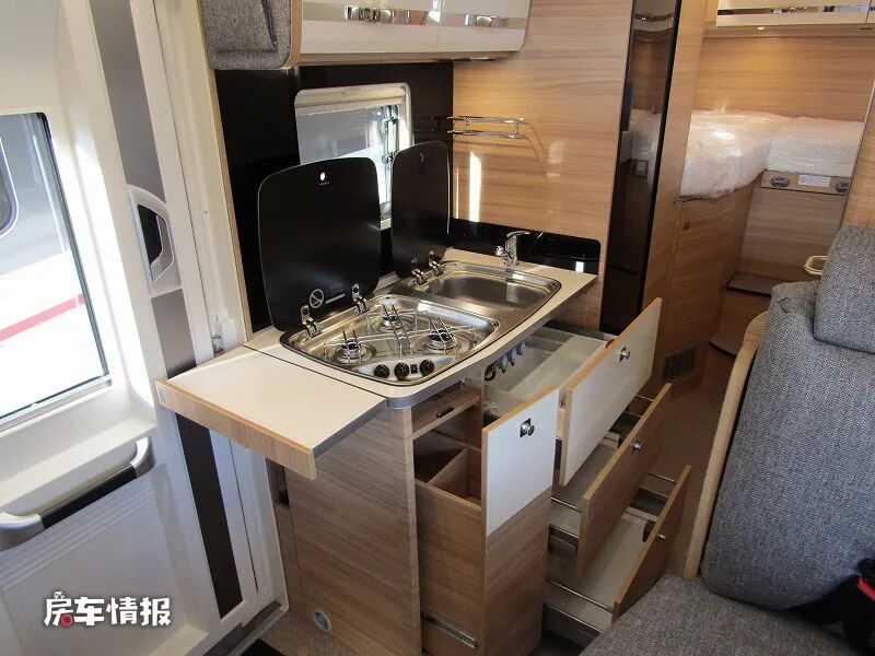 乘客门后方则是全车的厨房区,操作台的台面并不是很大,但是侧面带有可拓展的桌板,台面上提供了翻盖的三孔燃气灶和翻盖的不锈钢水槽,上下方还提供了大量的储物空间,可以满足烹饪材料和用具的存放需求。