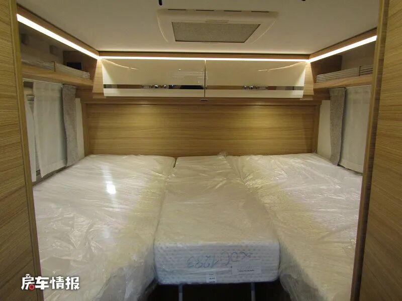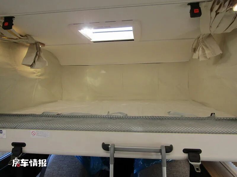 最前方驾驶室上方内带有一张额头床,顶部配了一个小型的天窗,日常也可以满足睡觉休息的需求。