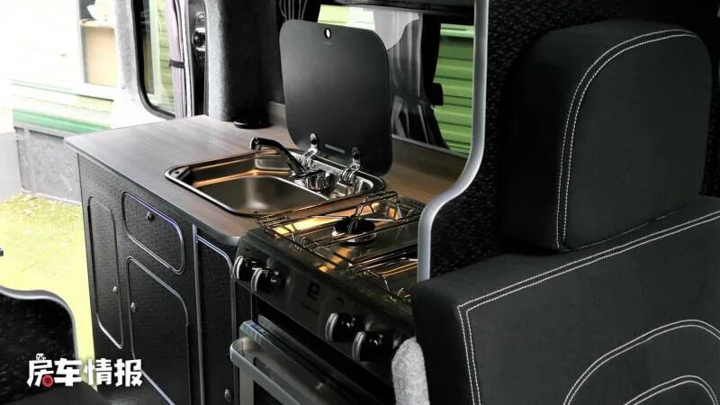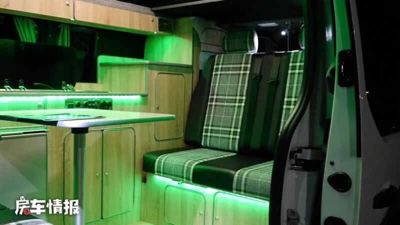这是一款4座的房车,除了驾驶室以外车厢内部还能同时乘坐两个人,内侧还配有简易厨房以供做饭使用,座椅前方的小餐桌可以根据使用需求拆卸。当夜晚需要休息时沙发座椅还可以变成一张床铺,加上升顶床,车内有两张床铺供使用。