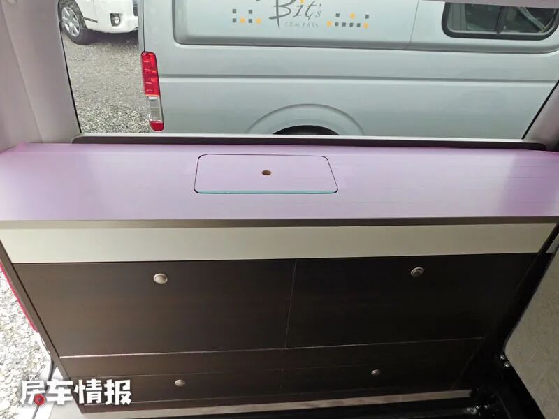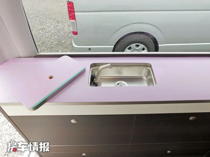车尾左侧有一个简易的厨房区域,由一个组合柜组成,操作台空间不是很大,不过有不锈钢洗菜池以及下面的水电装置。车内没有安装燃气灶和抽油烟机等其他厨房设施,所以需要自行携带,建议携带一个便携式卡炉到车外炒菜,毕竟车内空间不大,这样就可以避免油烟污染车内的环境。