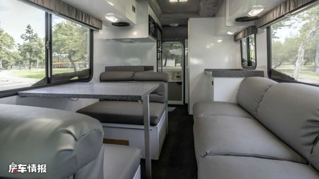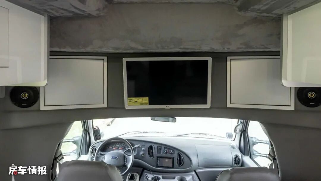 全车是采用的后上门的设计,车内的空间要比想象中宽敞,而且整体的采光度也很不错,虽然外观相对“花里胡哨”,但是内部的设计还是挺现代极简风的。驾驶室上方是提供了基础的电视,两侧带有封闭式的储物柜,日常可以存放行李或日用品,带有柜门的设计也防止在行驶过程中发生掉落。