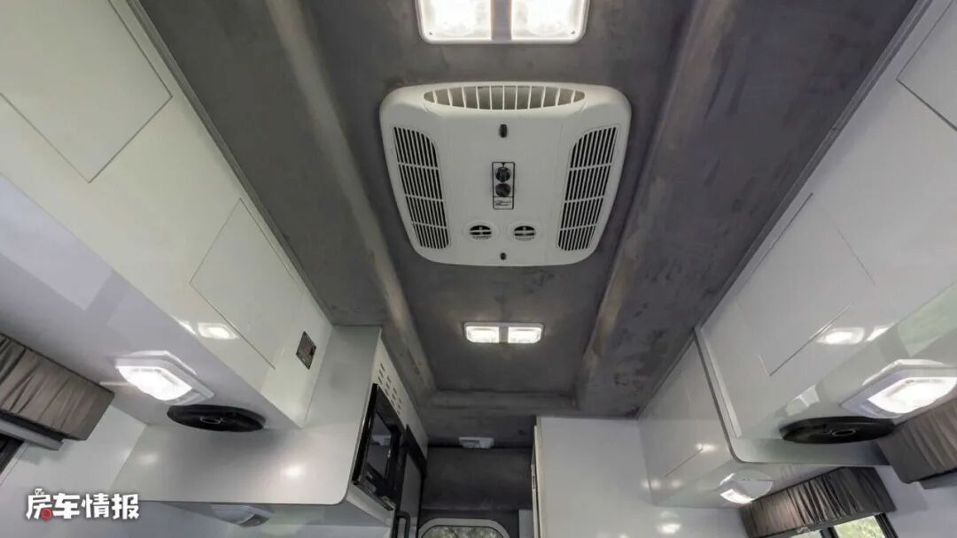 另外两侧顶部都配置了基础的吊柜,所以整个车内的储物空间还是相对比较充足的。车顶部则配置了一台顶置的空调,可以按需调节车内的温度从而达到较为舒适的居住环境。