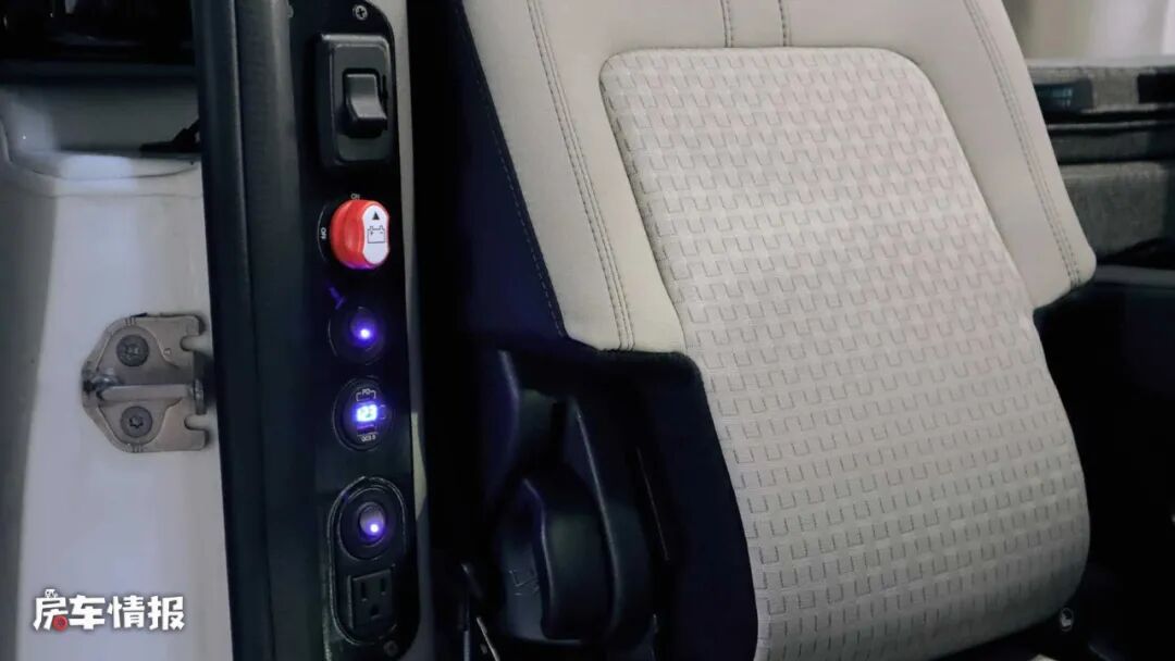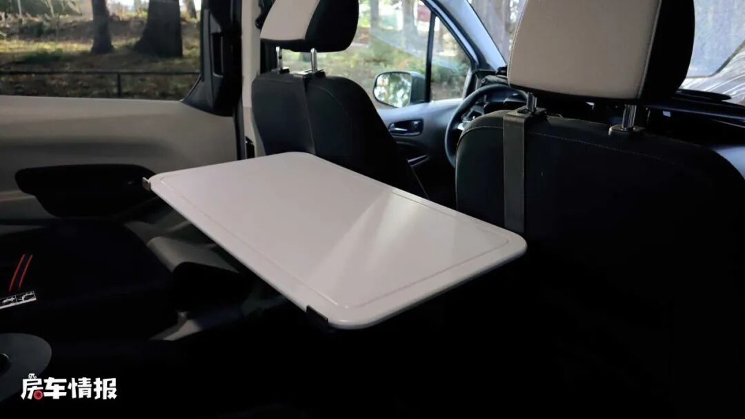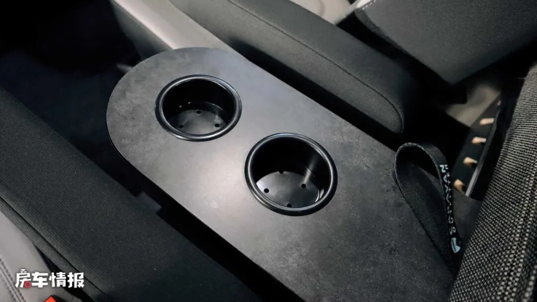 作为一辆露营车,遮阳棚也是必不可少的,不过这辆车并不是固定的遮阳棚,需要后期自己手动支起一个外置帐篷,用来遮阳避雨,并且可以打造出一个户外的露营区域。车厢内部还是保留了原底盘的设计,第二排乘客座椅也被原封不动的保留了下来,日常可乘坐,中间还带有杯托的小设计,整体满足四个人乘坐的需求。