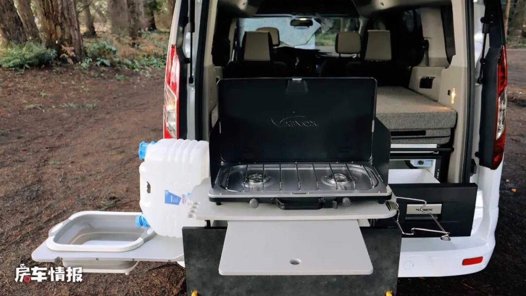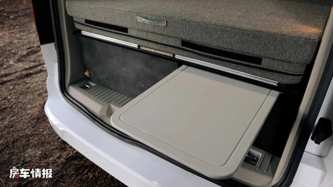右侧设计了一个小型的抽拉桌板,不过这个高度只能用作备菜,想要吃饭就得站着了,如果想坐着踏实吃顿饭,在车厢内的乘客座椅前方是提供了一个小型的折叠餐桌的,可以满足日常的需求,当然天气好的时候,也可以在遮阳棚下搭建一个户外的就餐区,更加惬意的享受美食。