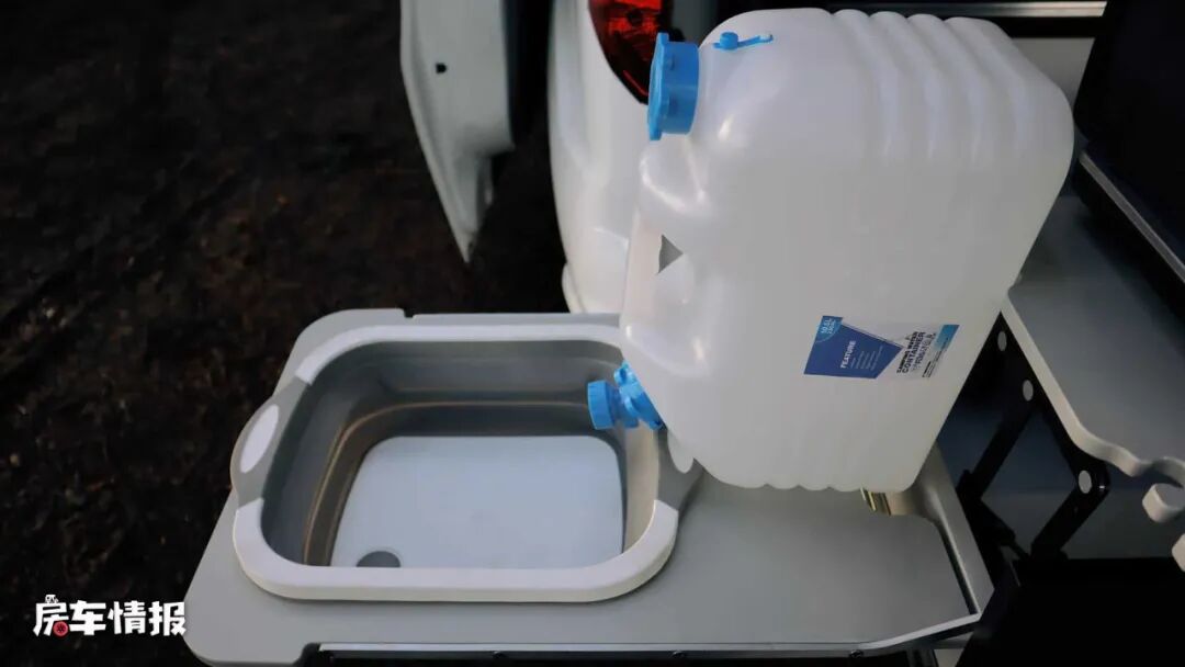 旁边则是一个折叠的简易水槽,可以满足普通的清洗需求,而我们日常所说的净水箱其实就是一个便携式的大号水桶。